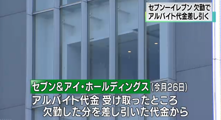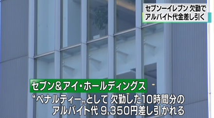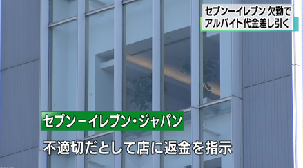 コンビニ大手の「セブン-イレブン・ジャパン」の東京・武蔵野市内のフランチャイズ店が、アルバイトの女子高校生がかぜで欠勤したことを理由にペナルティーとしてアルバイト代金を差し引いていたことがわかり、会社側は不適切だとして店に返金を指示しました。