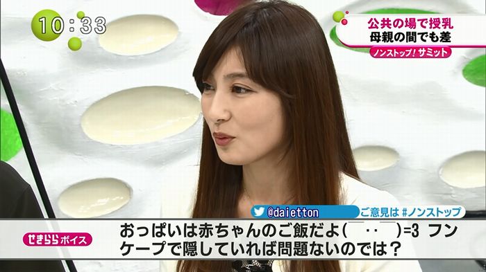 同じく大神いずみも「どうしようもないときがある」と公共の場での授乳に理解。カンニング竹山も「子どもがおなかを空かせているんだからどこであげても問題ない。変な目で見ているほうが問題」と子どもを持つ母親に寄り添った。
