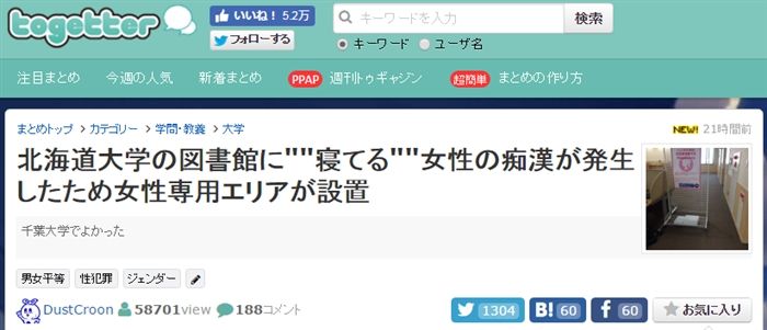 北海道大学附属図書館が1月25日、館内に女性専用席を設けたところ、「女性だけの専用席を作るのは不公平」との批判が多数寄せられ、翌26日に専用席の設置を取りやめるという事案がありました。
