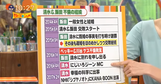 番組で、宗教法人「幸福の科学」に出家した女優・清水富美加とKANA-BOONの飯田祐馬が不倫関係にあったという話題を取り上げ、芸能レポーターの長谷川まき子氏が2人の共演が予定されていた仕事が結果的にキャンセルされたことを指摘した。