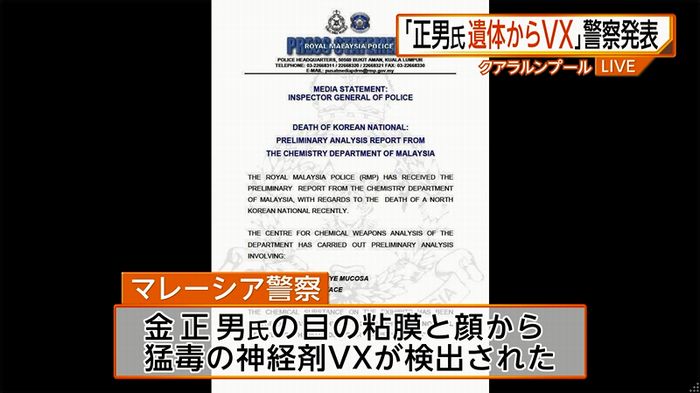 北朝鮮のキム・ジョンウン(金正恩)朝鮮労働党委員長の兄、キム・ジョンナム(金正男)氏が殺害された事件で、マレーシアの警察は24日、遺体を調べて分析した結果、猛毒のVXが検出されたと発表しました。警察は、実行犯として拘束されたベトナム人とインドネシア人の女2人はクリームのようなものをジョンナム氏に