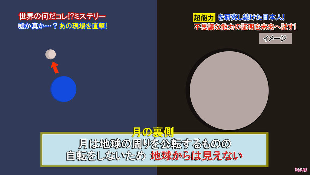 5日の放送では「月の裏側を念写する超能力者」を紹介するくだりがあり、そのなかで月の裏側が地球から見えない理由について「月は地球の周りを公転するものの、自転をしないため地球からは見えない」と説明していました。ちなみに月の裏側が地球から見えないのは、「自転をしない」わけではなく「公転と自転の周期が一致しているため」というのが正しい説明です(参考:JAXAによる説明)。