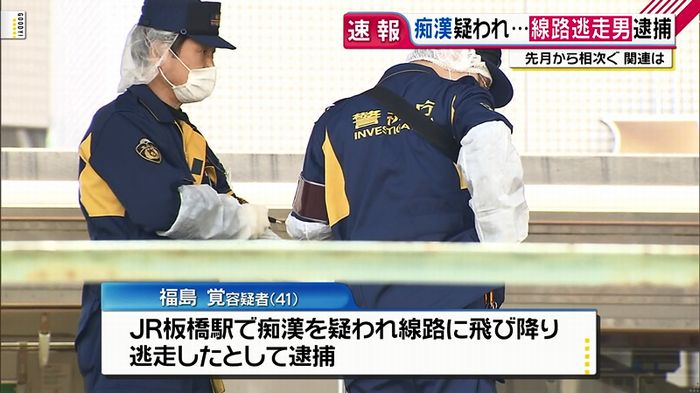 女性から痴漢行為をとがめられ、板橋駅ホームに降ろされると、線路に飛び降り、フェンスを乗り越えて逃走した。