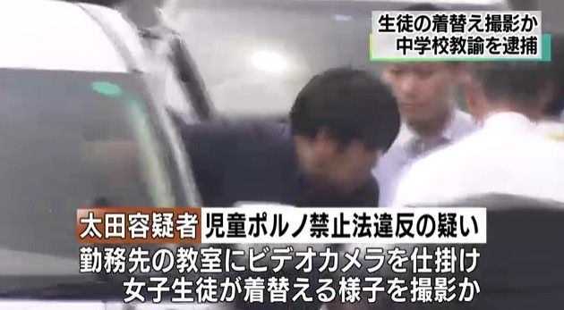 警察の調べによりますと、太田容疑者は去年5月までのおよそ1年間、勤務先の中学校の教室にビデオカメラを仕掛け、女子生徒が着替えている様子を撮影したとして、児童ポルノ禁止法違反の疑いが持たれています。