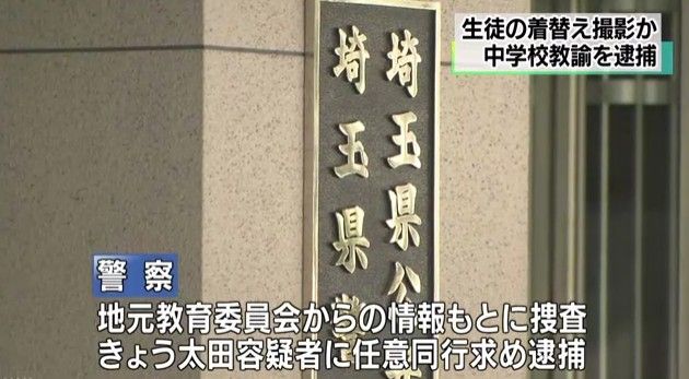 埼玉県内の中学校に勤務する45歳の教諭が、教室にビデオカメラを仕掛け、女子生徒の着替えを撮影したとして、児童ポルノ禁止法違反の疑いで警察に逮捕されました。