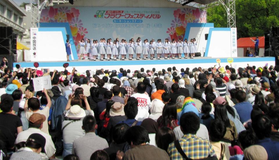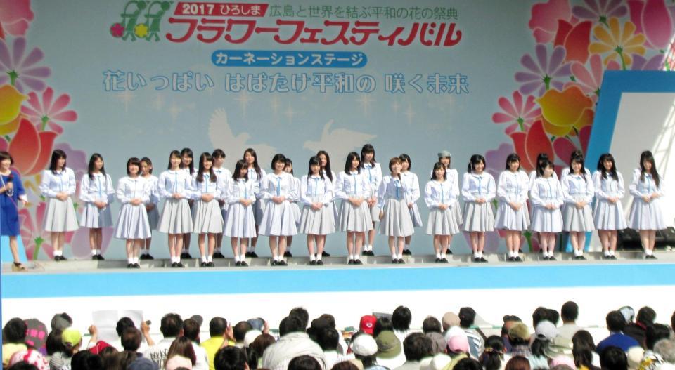 国内では6組目となるAKB48の姉妹グループ「STU48」が3日、広島市でこの日から始まった「ひろしまフラワーフェスティバル」で初お披露目された。