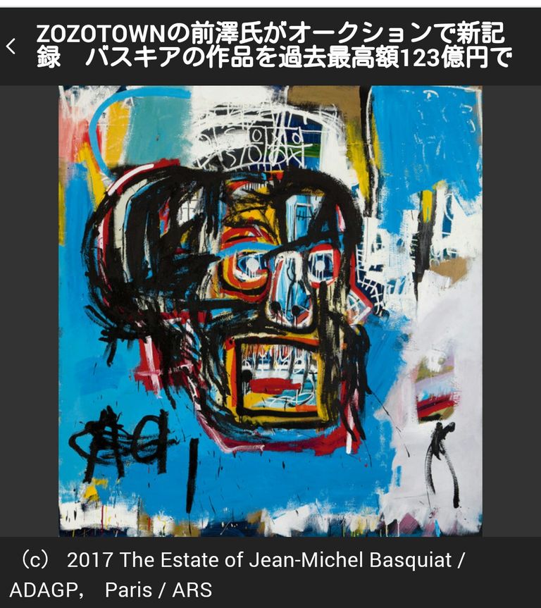 5月18日(現地時間)、ニューヨークで行われた競売大手サザビーズのオークションで、『ZOZOTOWN』などを運営する株式会社スタートトゥデイ代表取締役の前澤友作氏がジャン=ミシェル・バスキアの作品を1億1050万ドル(約123億円)で落札したことがわかった。