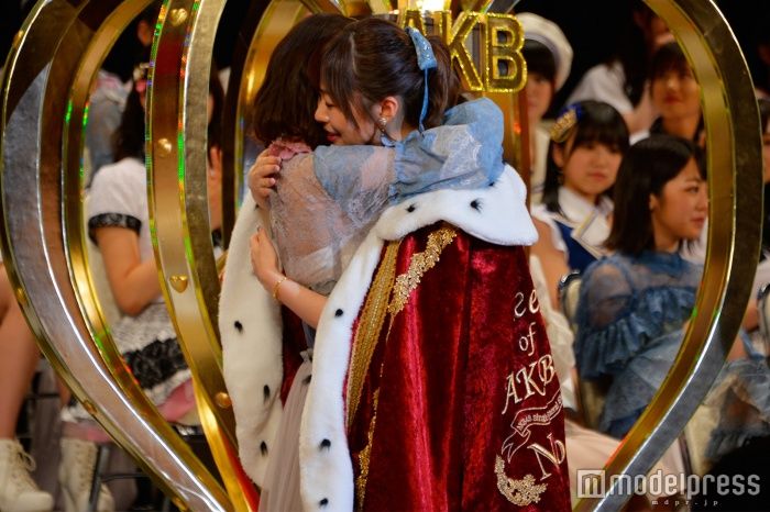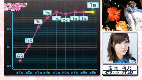 また、年内での卒業を発表した渡辺に「麻友ちゃん、えっと…(泣きながら)今は正直すごくショックで言葉になりません。ずっと頑張ってくれて、いなくなってどうなるかわからないけど、ドラマの時はすごく楽しそうで、そっちの方向に行くんじゃないなと思っていました」と思いを明かし「麻友の判断を応援したいと思います。頑張ってね」と、2人で抱擁すると「応援してくださった皆さん、ありがとうございます」と伝えた。〈中略〉過去の総選挙は第1回から27位→19位→9位→4位→1位→2位→1位。1位 HKT48 指原莉乃
