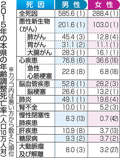 厚生労働省が5年ごとに公表している都道府県別の年齢調整死亡率(人口10万人当たりの死亡数)で、2015年の青森県の悪性新生物(がん)の死亡率は男女ともに全国ワーストとなった。脳疾患、肺炎、糖尿病で全国最悪水準となるなど、あらためて県民の健康意識や受診行動、医療体制の課題が浮き彫りとなった。