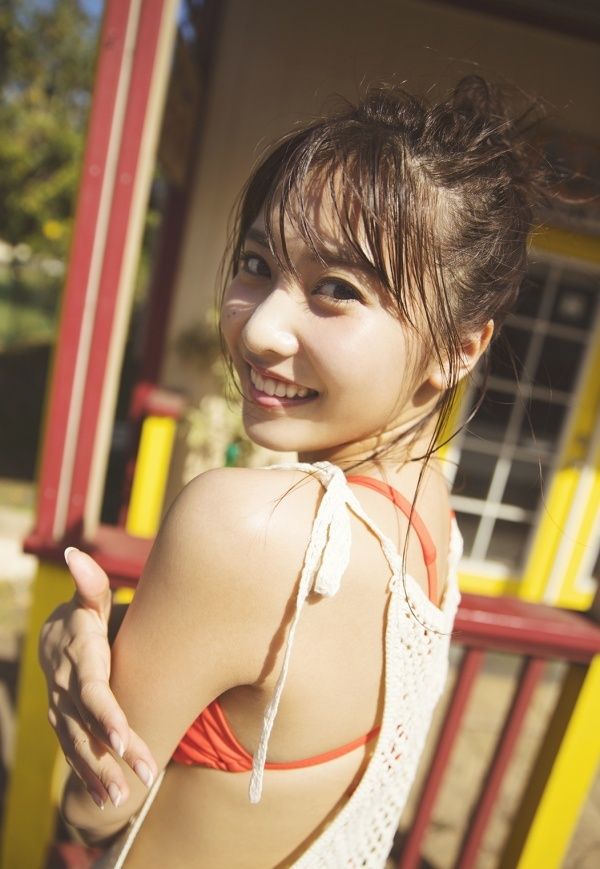 同誌には、朝の白い光が差し込むホテルの部屋で白いビキニでくつろぐ姿や、夜のビーチでは赤いビキニではしゃぐ様子などを収録。