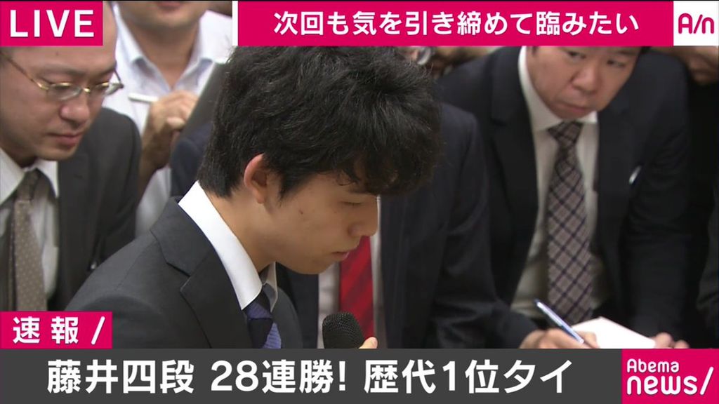 14歳藤井四段 歴代最多タイ28連勝!30年ぶりの偉業将棋の史上最年少プロ棋士、藤井聡太四段(14)が21日、大阪・関西将棋会館で王将戦1次予選に臨み、澤田真吾六段(25)に勝利。自らの持つデビューからの公式戦連勝記録を28に伸ばし、30年前に神谷広志八段(56)が打ち立てた最多記録に並ぶ偉業を達成した。こと。
