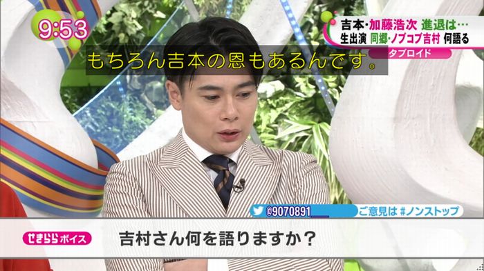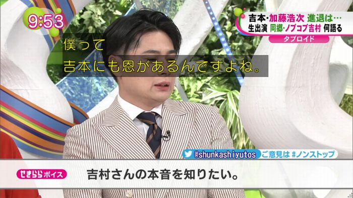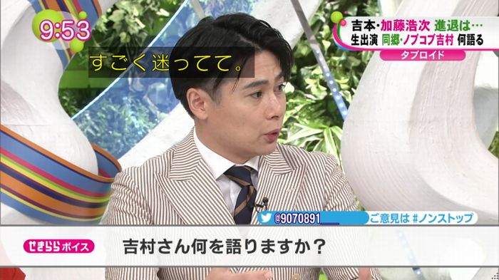 加藤の動きを受け、22日に「僕は北海道の人間です 何かあった時は北海道の人について行きます」とツイートしていた吉村。番組冒頭、当時の心境を尋ねられると「この時間を僕のために使うのは申し訳ない」と詫びつつ「吉本興業には恩がある。こんな僕がここまで来られたのは吉本のおかげ。でも、それと同じくらい加藤さんにも恩がある。(加藤を)好きなんです。なのでこういう形になった」と説明した。