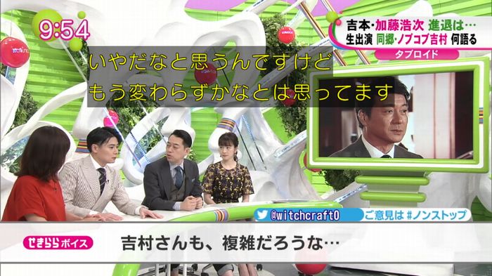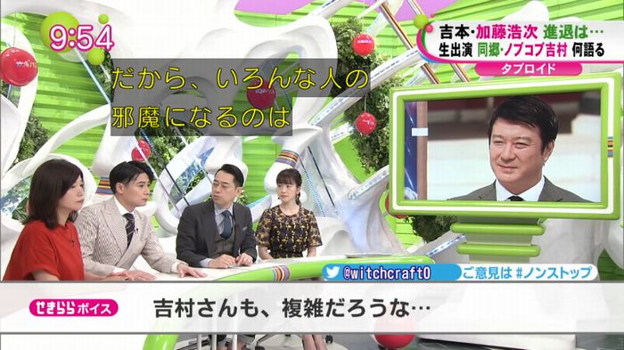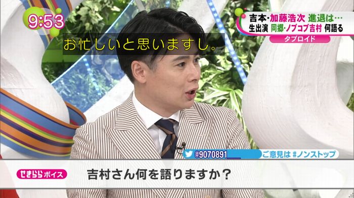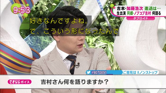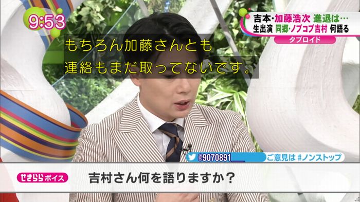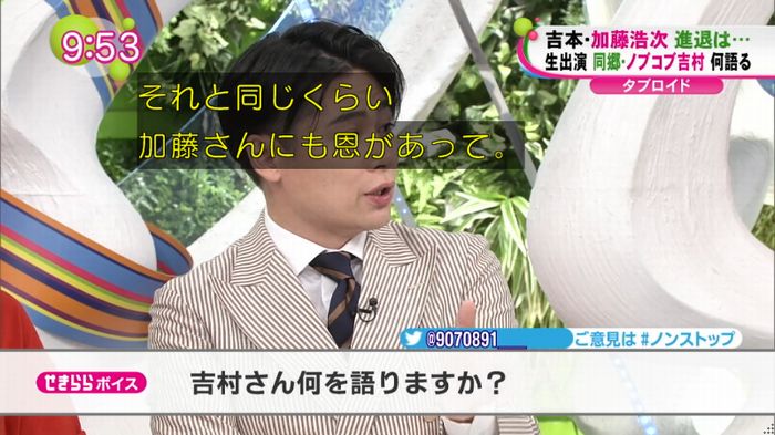 「加藤さんは寂しがり屋ですからね。そういうのも含めて」と吉村。加藤の今後の動向は分からないが、退社が決定した際には、追随するのかをMCの「バナナマン」設楽統から問われると「好きだなって思いますから加藤さんを…」と話すにとどめ、設楽から「明言しないな」とつっこまれる場面も。それでも、現在の事務所内の混乱ぶりを伝え「邪魔しちゃいけないと思っているので。いろんな人の邪魔になるのは嫌だなと。でも自分の中では(気持ちは)変わらない」とした。